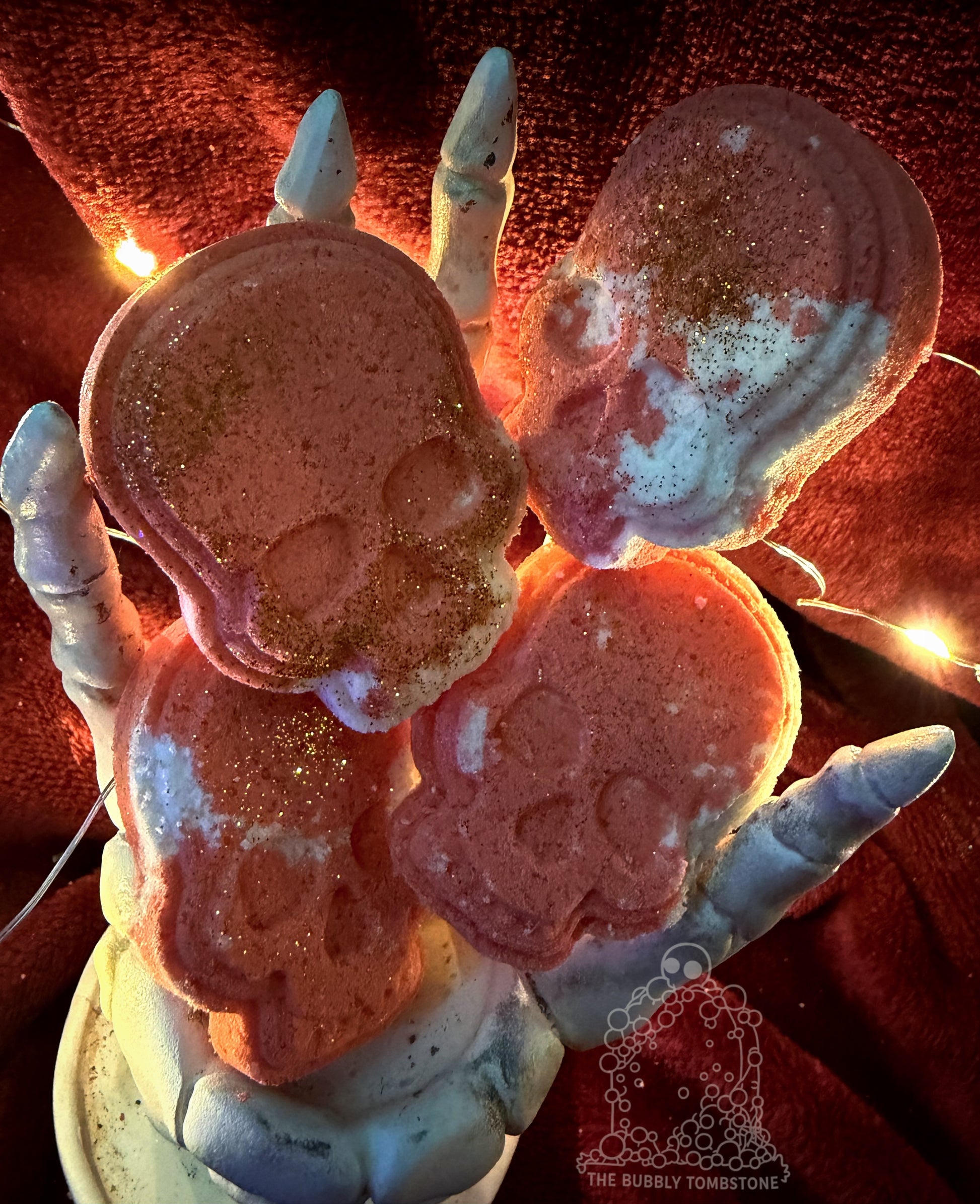 Each set includes four hand-pressed skull bath bombs, made with Epsom salts for muscle-soothing relief and finished with gold eco glitter for a subtle, flickering glow in the water. Theyāre fast-fizzing to deliver that soak even fasterā”ļø